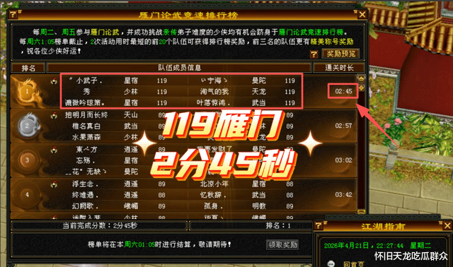 人所共知,雁门基本齐是80组独占鳌头——毕竟80组的怪物会防少了30点,b体育官方app下载血量也少了1500万,而80组大佬们输出却不输119大佬们!此消彼长之下,让雁门竞速成为了80组的秀场!