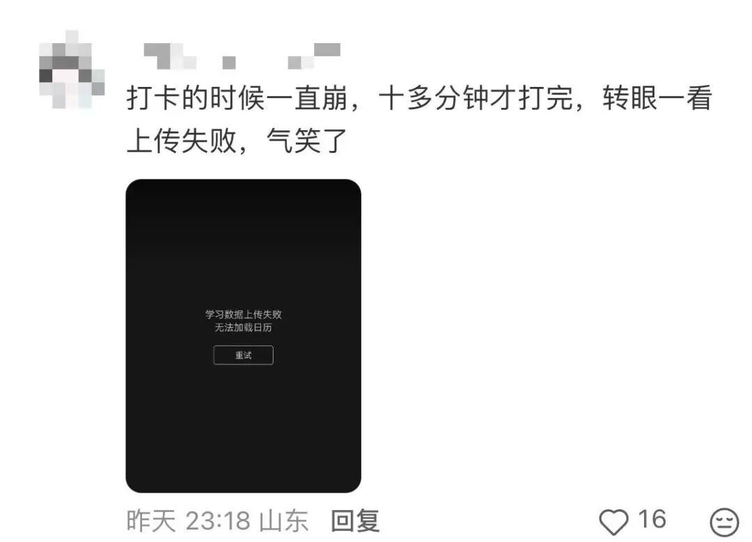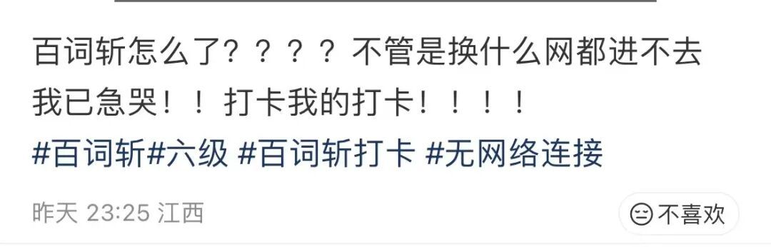23日晚,有不少网友在外交平台发文称,背百词斩窘态出现“蚁合诞妄”“学习数据上传失败无法加载日期”等指示,为此,有网友蹲在路由器旁不竭刷新,可依然无法泛泛进行学习打卡,“重启手机,重连蚁合,把百词斩卸载了又再行安设,皆没灵验。”以致有网友称:“连络打卡几百天了,打不了卡急哭了。”