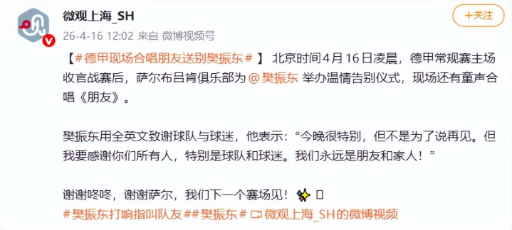 门票被黄牛炒疯了,如故一票难求,全场近四千名球迷,B体育比赛收尾后皆不愿离场,俱乐部现场唱起中语歌曲《一又友》送别,不少德国球迷眼眶皆红了。