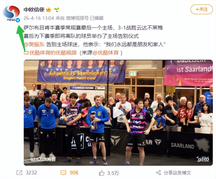更令东谈主不测的是,4月16日,社交部欧洲司官方微博“中欧信使”,平直转发了樊振东告别战的视频。