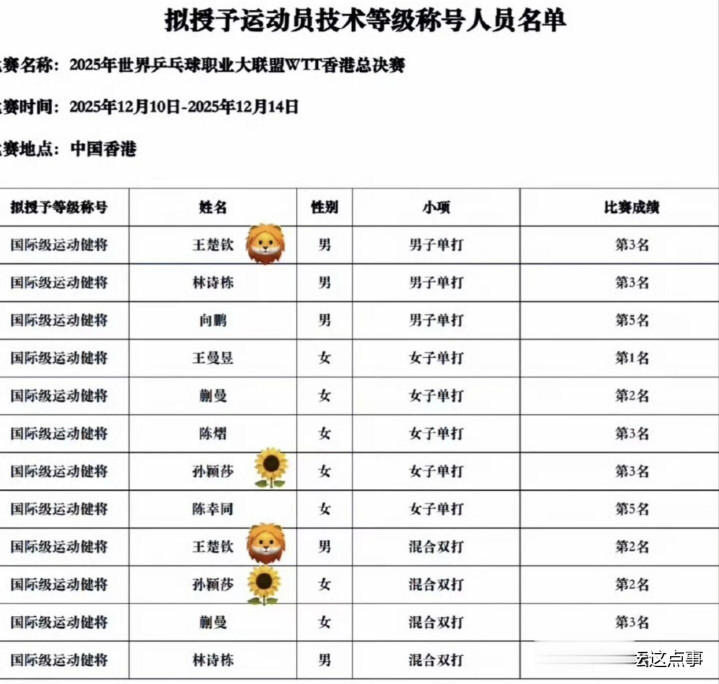 旧年WTT香港总决赛,孙颖莎和王楚钦天然莫得夺得冠军,因伤退赛,但取得的排行也达到了健将的条件。