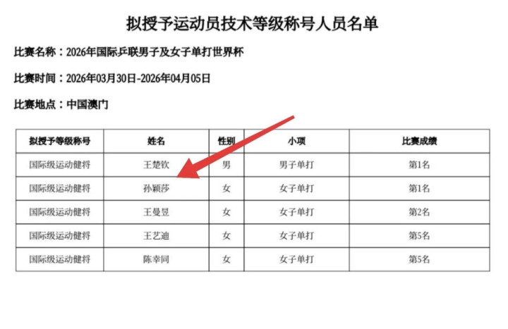 4月8日,澳门寰宇杯打完,王励勤再次给优秀的畅通员授奖。乒协公布了得到国外级畅通健将的名单,孙颖莎和王楚钦依旧所以单打第又名排在首位。