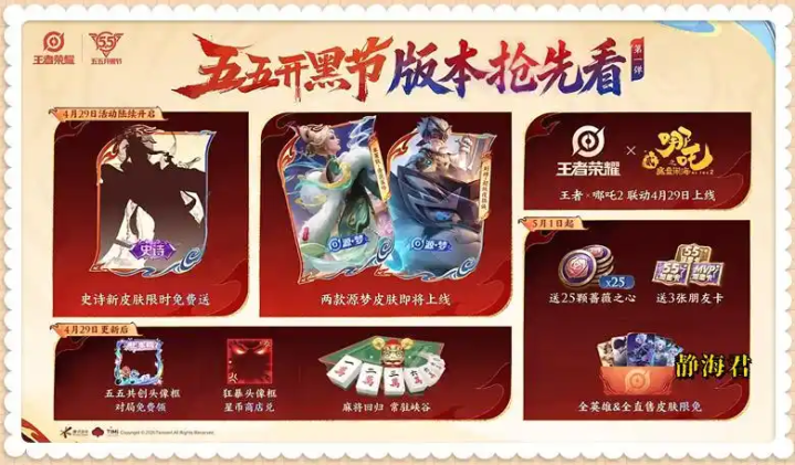传闻边界:哪吒的魔丸-哪吒、敖隐的灵珠-敖丙,这两个皮肤的品性皆是传闻边界,首周(4月29日~5月5日)仅需990点券/款,即可拿下。